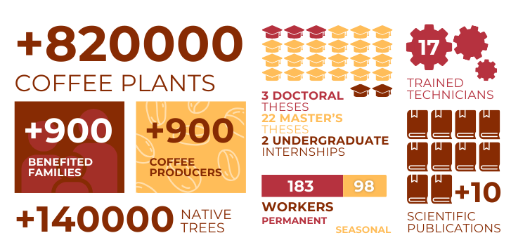 The TriCafé project focuses on biodiversity conservation and human development, based on coffee production in an agroforestry system, the capitalization of ecosystem services (coffee, native trees, mushrooms, and carbon), and the circular economy (water, bioenergy, biogas, and biofertilizers).
